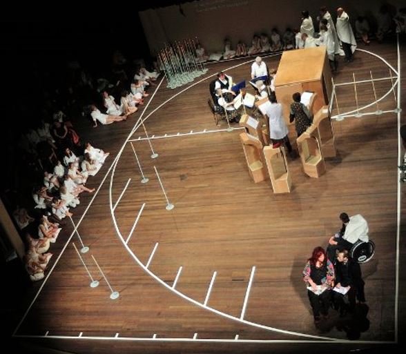 De keuze voor een bijna neergelaten brandscherm op het podium, om zo een grotere dieptebeleving van de ruimte te creëren, was de oorzaak van een aantal technische problemen die onze kleine groep niet gemakkelijk snel kon corrigeren. Daaruit vloeiden vanwege beide jury’s kanttekeningen bij de productie. In de nieuwe ruimte bleek de emotionaliteit van de huiskamerversie door technische problemen en botsende vormkeuzes aan betrokkenheid in te boeten.